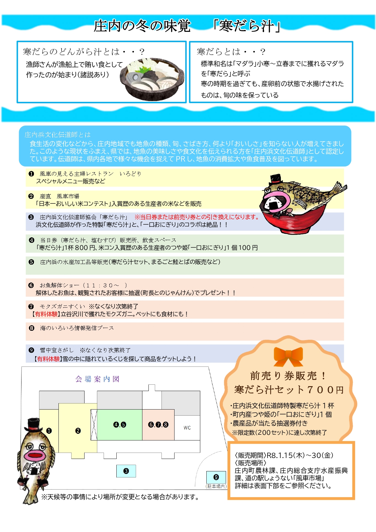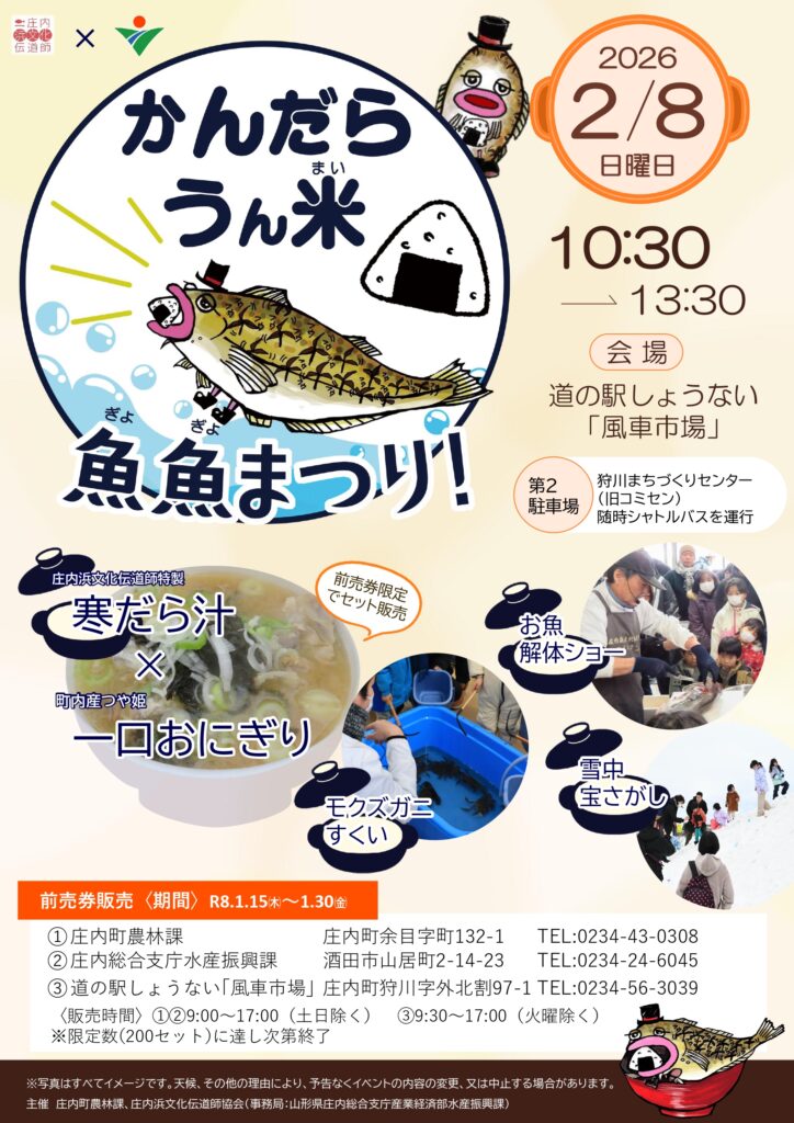 庄内浜文化伝道師協会(事務局:山形県庄内総合支庁水産振興課)と庄内町農林課との共催で、第4回の「かんだら うん米 魚魚まつり!」を開催します。毎回大好評の「寒だら汁販売」だけでなく、「雪中宝さがし」や「モクズガニすくい」など、盛りだくさんの内容となっておりますので、ぜひお越しください。