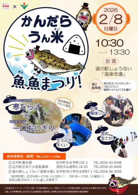 令和8年2月8日(日曜)に「道の駅しょうない」を会場に開催します! 庄内浜文化伝道師協会(事務局:山形県庄内総合支庁水産振興課)と庄内町農林課との共催で、第4回の「かんだら うん米 魚魚まつり!」を開催します。毎回大好評 […]